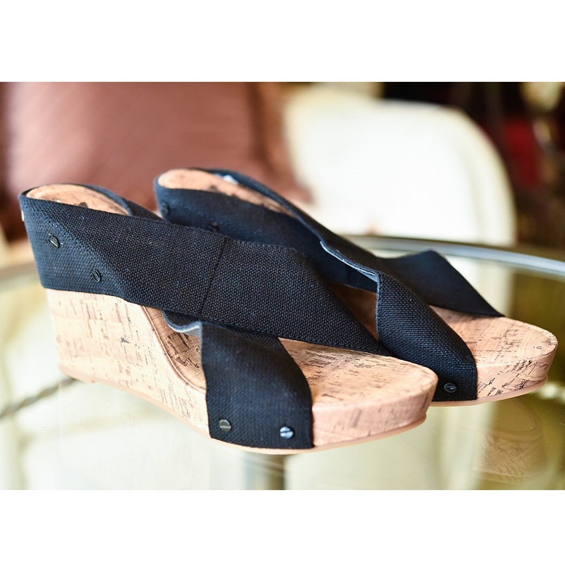 4" Wooden Wedge Sandal with Black Crisscrossed Straps